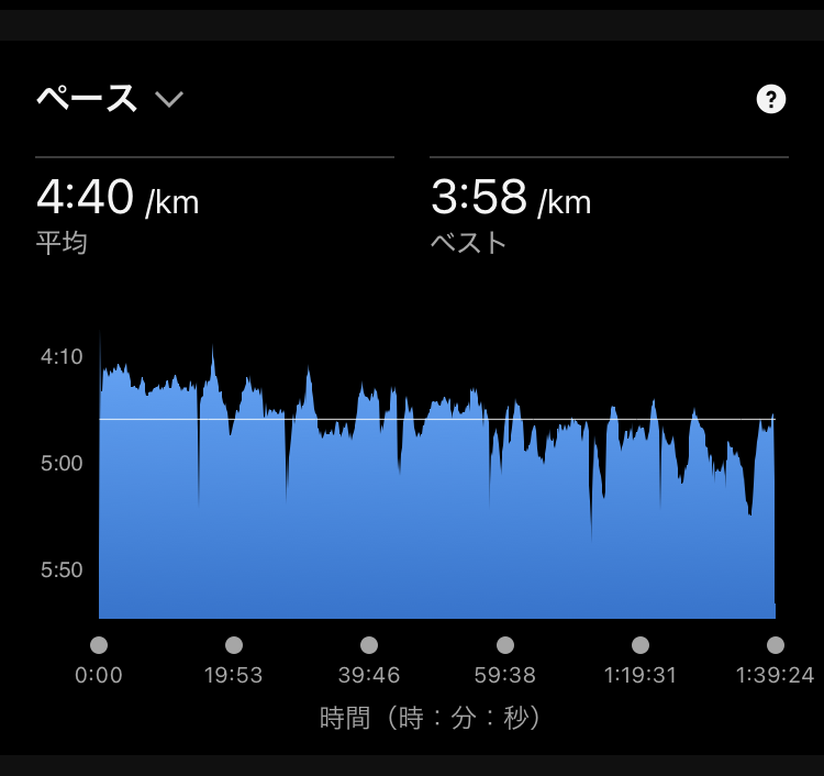 1時間40分を切れたことはよかったですが、完全に前半の突っ込み貯金のお陰で、このパターンではフルマラソンは撃沈間違いなしの典型的なレース内容でした。