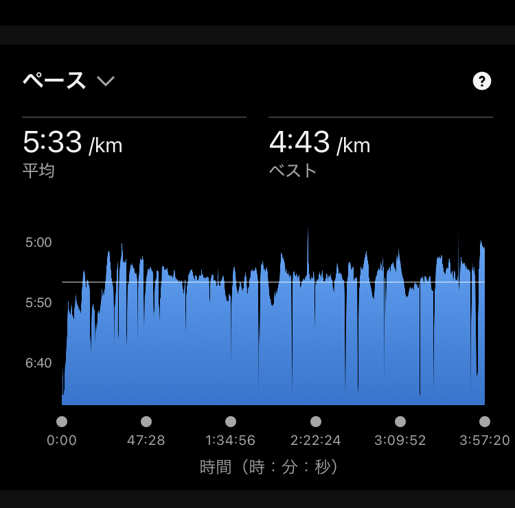 今までのスマホ管理では最初から飛ばして後半失速か、ひよってペースが上がらずサブ4は達成できなかったと思います。