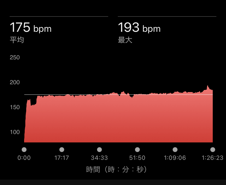 当時の年齢49歳の最大心拍数は(220-年齢)171なので、160を超えないように管理しながらでした。