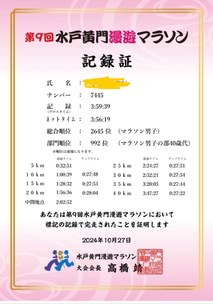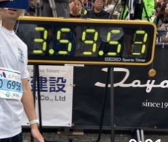 初ハーフは失速、初フルは3時間59分39秒のギリギリサブ4。