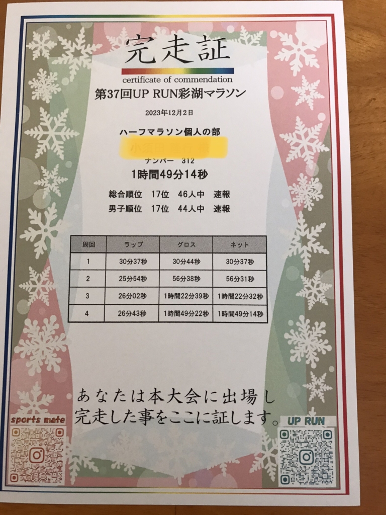 2023年12月2日 彩湖マラソン(ハーフ)